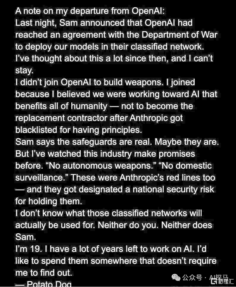 这波舆论风暴中,最扎心的一(yi)刀来自(zi)OpenAI内部,年仅19岁、被视为核心算法团队(dui)未来的天赋工程师Potato Dog,因反对与(yu)国防部合作愤然辞职,转头就加入了Anthropic。