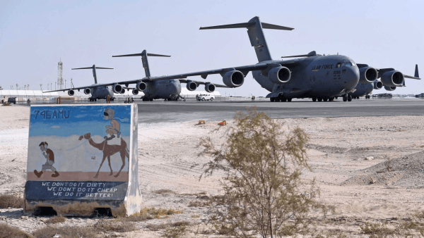 美国空军C-17环球霸王飞机停靠在卡塔(ta)尔乌代(dai)德空军基(ji)地,美国在中(zhong)东招募(mu)的本地职工(gong),时薪(xin)甚至只有(you)1美元(yuan),而本钱高昂的“招募(mu)贷(dai)”,本金就高达6,000美元(yuan),不借甚至不给上岗。